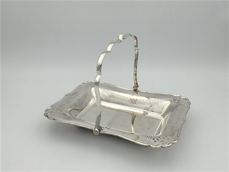 Cestino in metallo argentato con bordo mosso traforato e manico a volute, su piedi a trottola