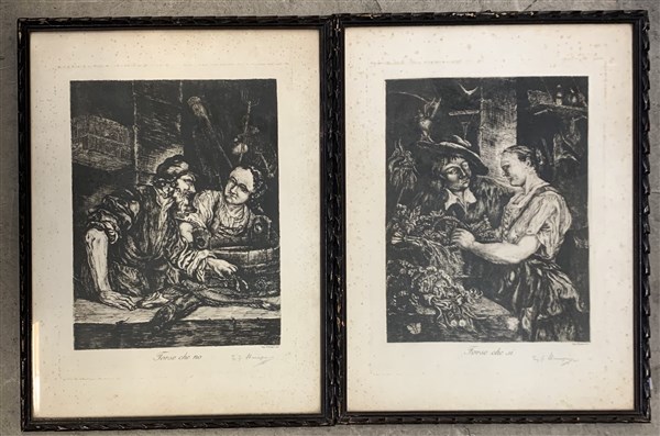 Coppia di acqueforti raffiguranti "Forse che no" e "Forse che si" (cm 29x38), in cornici (difetti)