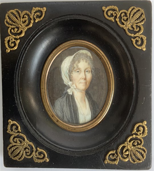 Artista del secolo XIX "Ritratto di donna con cuffia" miniatura ovale (cm 5x4) In cornice coeva con fregi in bronzo