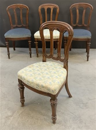Gruppo di quattro sedie in noce con schienale a giorno a listelli, gambe anteri
