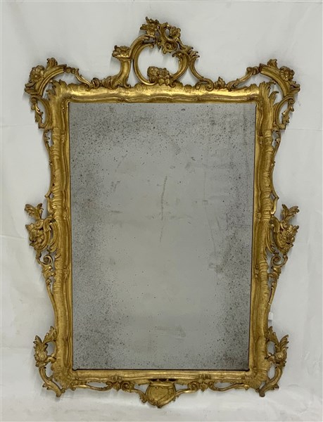 Specchiera con cornice in legno scolpito e dorato a volute, foglie e fiori.(cm 80x120) (difetti e restauri)