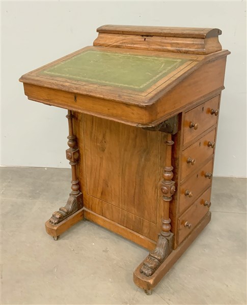 Scrittoio Davenport filettato in legno scuro, cassetti laterali, gambe intagliate, piano in pelle. Inghilterra, secolo XIX (cm 53x85x53)