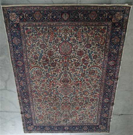 Tappeto Keshan, Persia, secolo XX. Decoro floreale policromo su fondo bianco. Bordura Herati su fondo blu (cm 300x208) (difetti)
