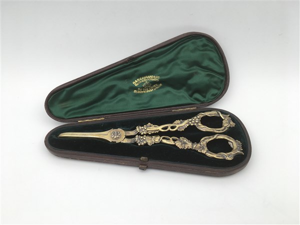 Forbice per uva in metallo dorato, in custodia. Inghilterra secolo XX (difetti)