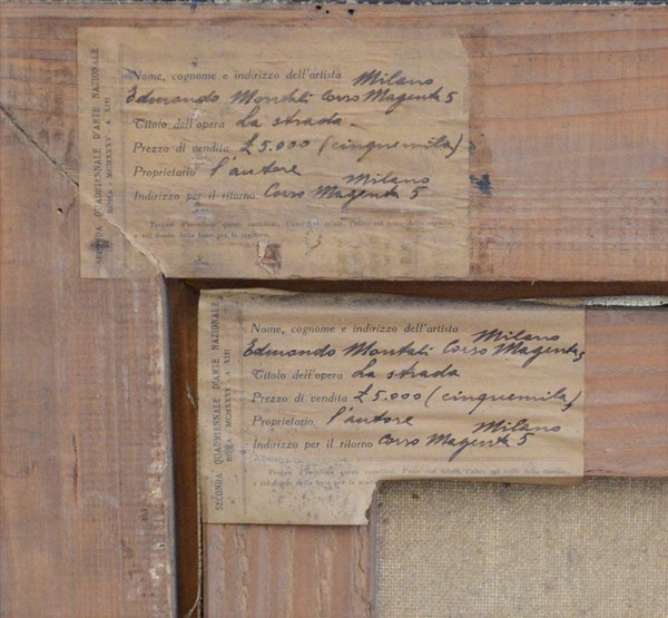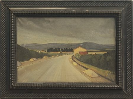 "La strada" olio su tela (cm 37x55) Firmato in basso a destra. Al retro: cartigli della II Quadriennale d'Arte Nazionale 1935, Roma. In cornice