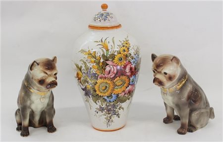 Lotto composto da due sculture raffiguranti "Cani" ed un vaso con coperchio in ceramica decorato a fiori (difetti e mancanze)