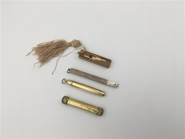 Lotto composto da un set da manicure, un porta profumo in oro, un portamine e un porta rossetto in metallo dorato (lievi difetti)