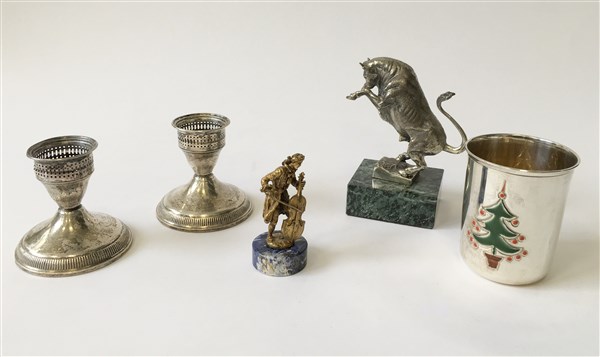 Lotto composto da cinque oggetti diversi in argento di cui due con basi in marm