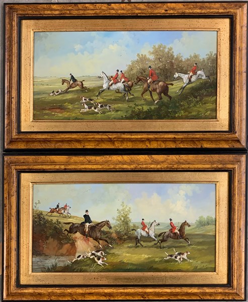 Ignoto, coppia di dipinti ad olio su rame raffiguranti "Scene di caccia alla volpe" (cm 20x40) siglati C. M. in basso a destra. In cornici