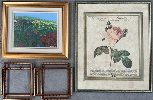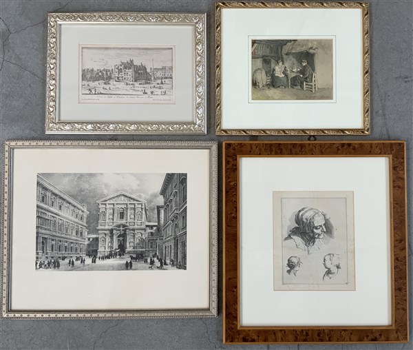 Cartone contenente cinque tra incisioni, tra cui una di Israel Sylvestre e una di Boemaert, riproduzioni, un dipinto ad olio e quattro piccole cornici (difetti)