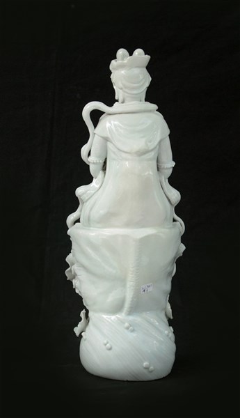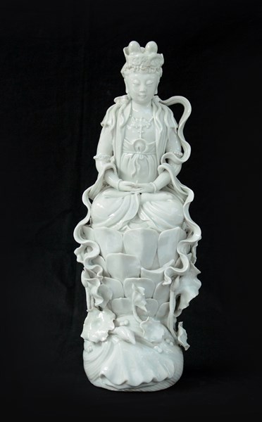Guanyin in porcellana bianca assisa su fiore di loto (difetti e restauri) Cina,