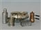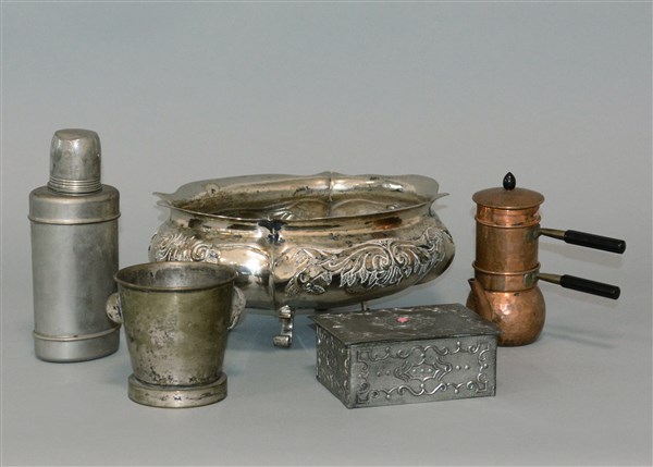 Lotto composto da un centrotavola, una scatola con coperchio, un vasetto biansato, un thermos ed una caffettiera napoletana in metallo, rame, peltro e legno (difetti)