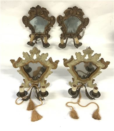 Lotto composto da due coppie di cartaglorie montate ad appliques a due luci in legno laccato. Secolo XIX (h. max cm 30) (difetti)