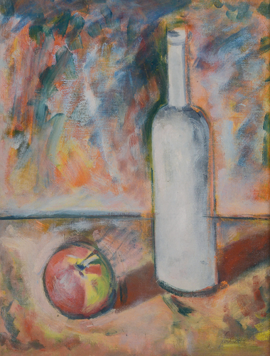 ALBINO GALVANO Torino 16/12/1907 - Torino 1991 Bottiglia e mela, 1946 olio su tela applicata su cartone cm. 43x33,5; firma e anno in basso a destra, firma, anno, etichetta e timbri della Galleria d'Arte Accademia (TO) al retro, timbro e firma per autenticità e provenienza della Galleria d'Arte Accademia (TO) su foto.