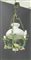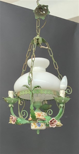 Lampadario di forma circolare a tre luci decorato a fiori e foglie, struttura in ceramica e ferro battuto policromo, paralume in vetro di forma sferica (h cm 80). (difetti)