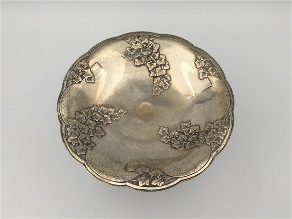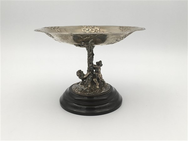 Alzatina in argento con sostegno raffigurante giochi di fanciulli sotto una pianta d'edera. Base circolare in legno ebanizzato (h cm 13) (gr 700 lordi) (difetti)