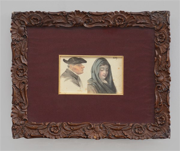 Scuola del XIX Secolo "Ritratti" acquarello (cm 9,5x16) In cornice di legno intagliata