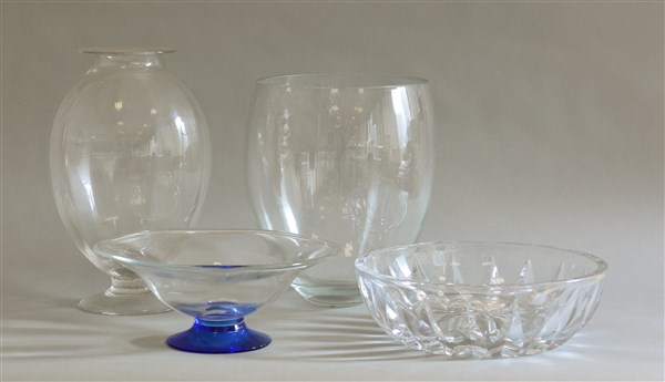 Lotto composto da due vasi in vetro trasparente incolore uniti a due centrotavola in vetro trasparente incolore di cui uno con base in vetro trasparente bludi epoche e manifatture differenti. Secolo XX. (misure diverse) (lievi difetti)