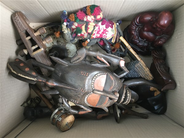 Cartone contenente numerosi oggetti etnici e orientali (difetti)