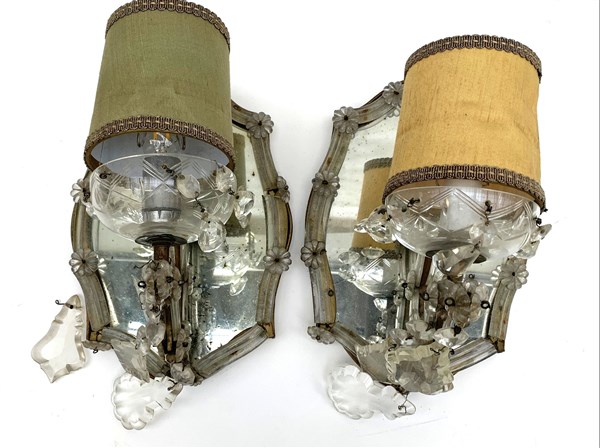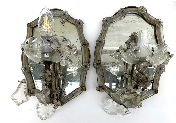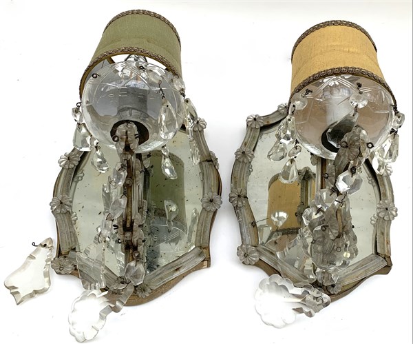 Coppia di piccole ventole di forma mossa a una luce con struttura in metallo e vetro, decorate a fiori e pendenti in vetro (h cm 28) (difetti)