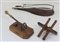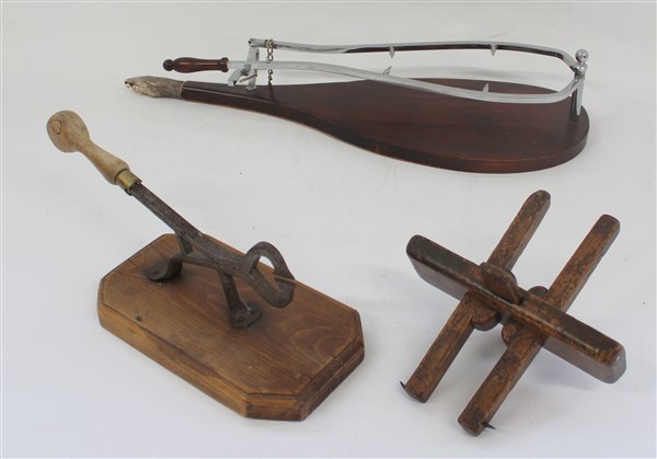 Lotto composto da una morsa per prosciutto e due oggetti diversi in legno e metallo