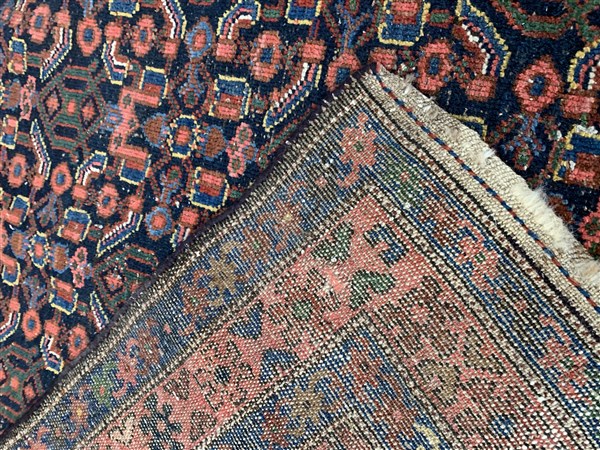 Tappeto Hamadan, Persia, inizio secolo XX. Decoro Herati su campo blu (cm 208x123) (Difetti)