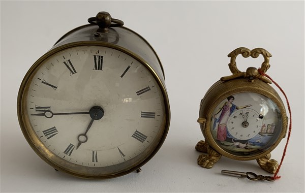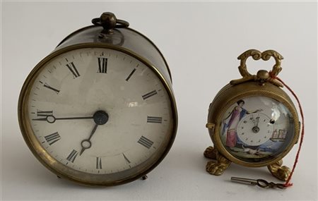 Lotto di due orologi di forma circolare di cui una sveglia e uno montato in cassa di bronzo con movimento della prima metà del XIX Secolo con suoneria delle ore e quarti a chiamata.