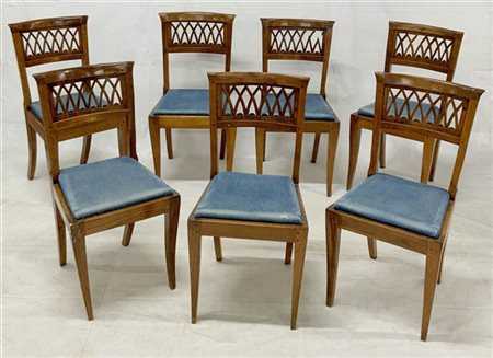 Gruppo di sette sedie in legno con schienale a cartella traforata, gambe a sciabola. Secolo XIX (difetti)