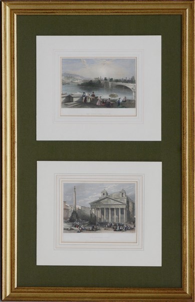 Coppia di Incisioni a colori del secolo XIX raffiguranti il Pantheon, Roma e il fiume Dora, Torino. In cornici (difetti)