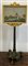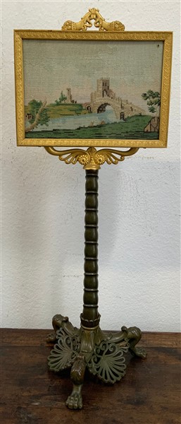 Ventola in bronzo con fusto tornito e ricamo a piccolo punto raffigurante veduta del Tevere entro cornice dorata. Roma, XIX secolo (h. 44 cm) (difetti)