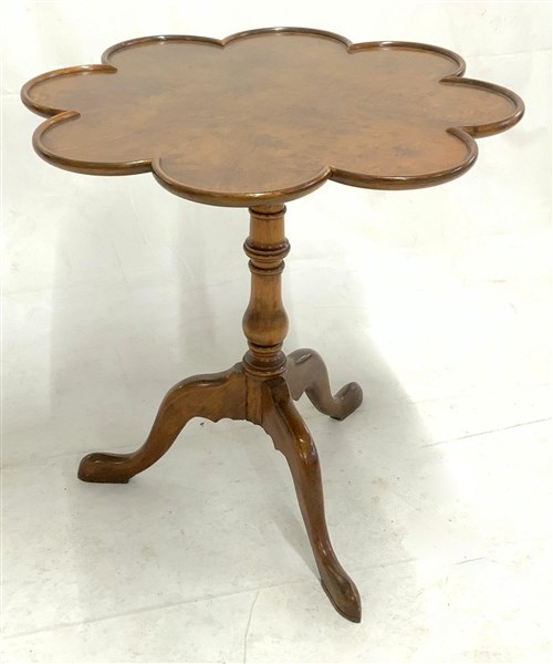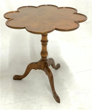 Tavolo a vela tripode con piano sagomato in mogano, sostegno a balaustro. Inghilterra, secolo XIX (cm 68x70) (difetti)