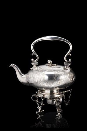 Samovar in metallo argentato con corpo inciso a cartelle e girali vegetali, pre