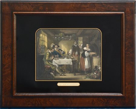 Incisione a colori del secolo XIX raffigurante interno di cucina con avventori. Titolata "Gil Blas a Pennaflor" (mm 190x250 circa) In cornice
