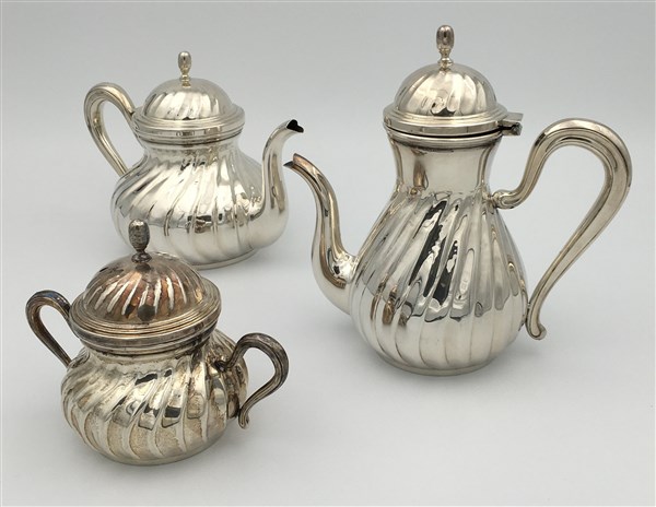 Parte di servizio da te e caffè in argento liscio a corpo piriforme e costolato, composto da teiera, caffettiera e zuccheriera con prese dei coperchi a goccia. Titolo 800 (g 900) (lievi difetti)