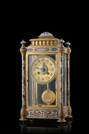 ANONIMO Pendola in metallo smaltato e vetri. Cassa di forma parallelepipeda dec