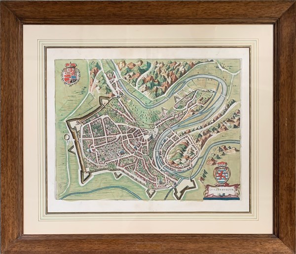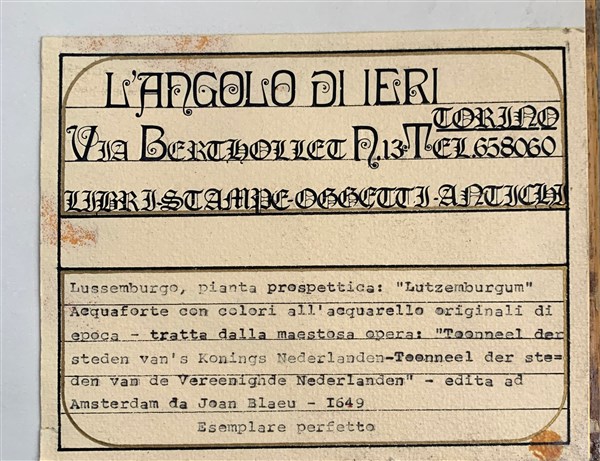 Scuola del secolo XIX, pianta prospettica della città di "Lutzemburgum" acquaforte acquarellata tratta dall'opera "Toonneel der steden van vereenighdie Nederlanden" edita ad Amsterdam da Joan Blaeu nel 1649, mm 560x460. Provenienza Galleria L'Angolo di Ieri Torino, timbro al retro