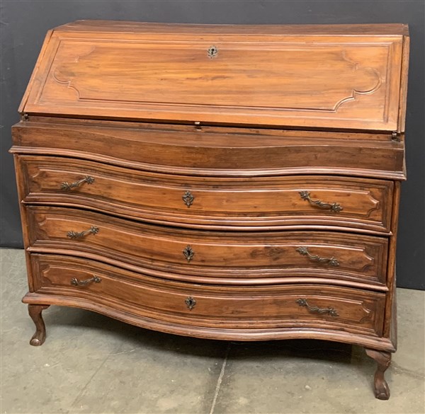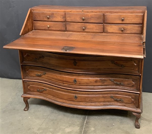 Ribalta con fronte mosso a tre cassetti e alta ribaltabile celante cassettini e segreti, piedi mossi intagliati ad artiglio. sec. XVIII (cm 125x106x59) (difetti)