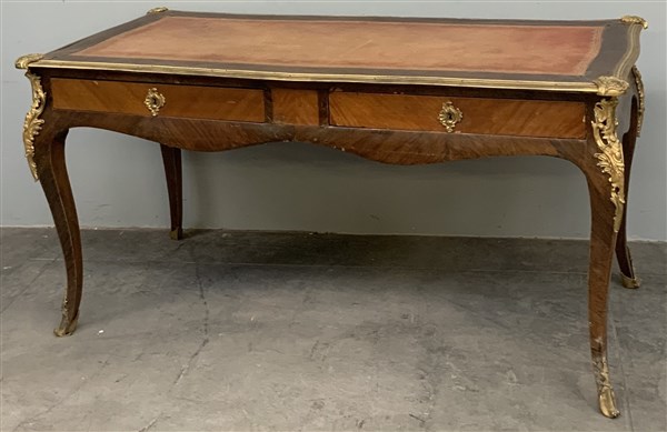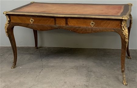 Scrivania diplomatica lastronata in legni vari a due cassetti con profili e montanti decorati da applicazioni in bronzo dorato. Gambe mosse munite di scarpette, piano in marocchino rosso impresso in oro (cm 144x76x70) (difetti)