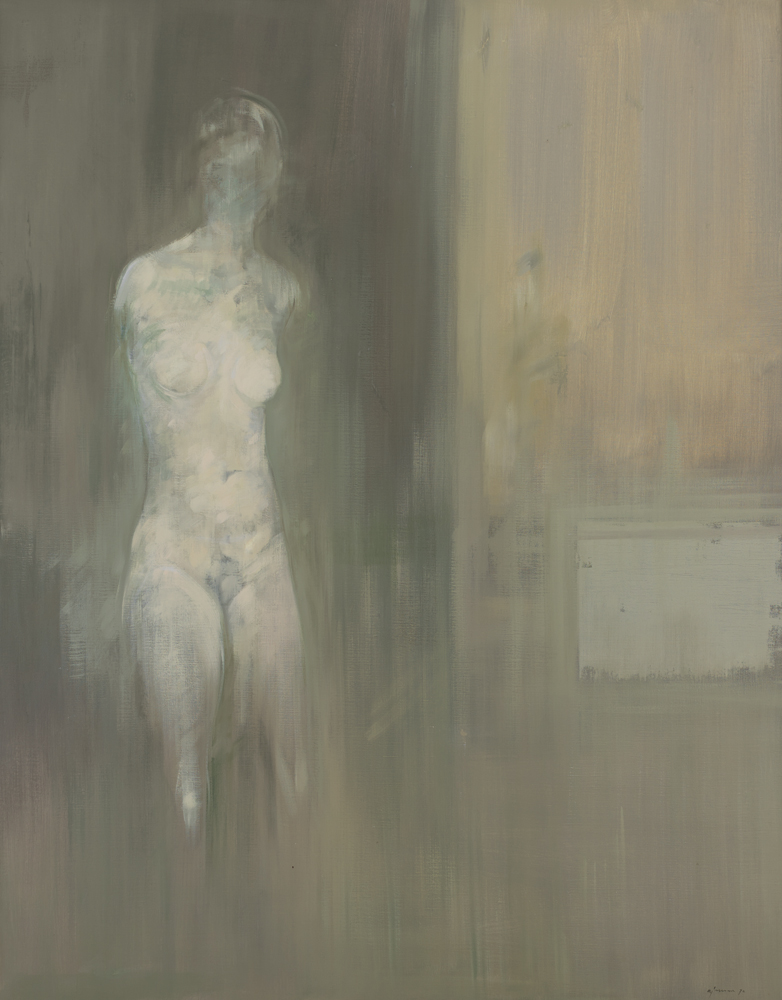 GIUSEPPE AJMONE Carpignano Sesia 17/02/1923 - Romagnano Sesia 07/04/2005 Nudo nello studio, 1972 olio su tela cm. 146x113, firma e anno in basso a destra, titolo, anno ed etichetta della X Quadriennale Nazionale d'Arte di Roma 1972-73 al retro, dichiarazione d'autenticità dell'artista su 2 foto, opera registrata presso l'Archivio Giuseppe Ajmone al numero B/52 come da dichiarazione su foto.