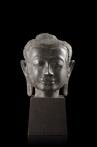 Manifattura del Sud-Est asiatico. Scultura in bronzo raffigurante testa di Buddha, poggiante su base lignea, sec. XIX (lievi difetti)