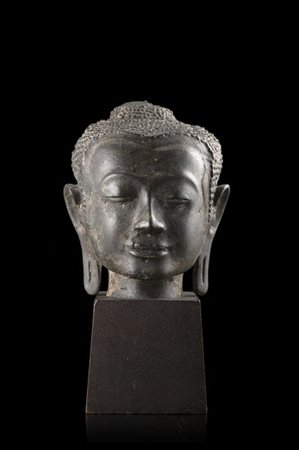 Manifattura del Sud-Est asiatico. Scultura in bronzo raffigurante testa di Budd
