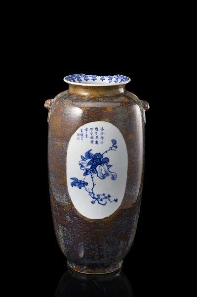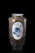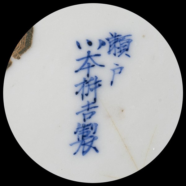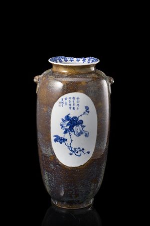 Manifattura giapponese, vaso in porcellana decorato a riserve e iscrizioni in bianco e blu, inizio secolo XX (difetti)