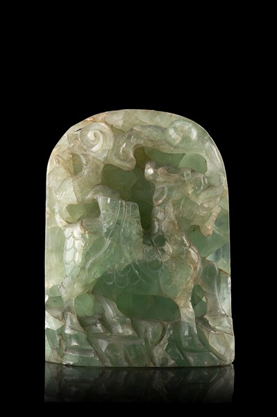 Manifattura orientale. Composizione in pietra dura raffigurante figura ferina i