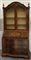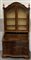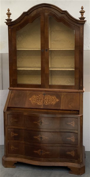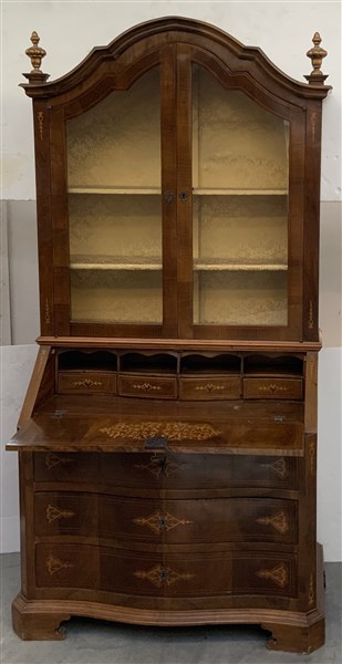 Trumeau lastronato, filettato e intarsiato a volute in legno chiaro. Fronte mosso a tre cassetti con anta ribaltabile celante vani e cassettini. Parte superiore sagomata a due ante a vetri con pinnacoli dorati. Seconda metà sec. XVIII (cm 114x226x54) (difetti e restauri)