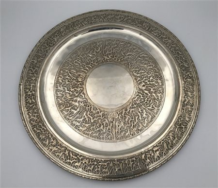 Grande piatto in argento decorato nel bordo e nel cavetto ad animali fantastici. India, inizio sec XX. Titolo 800 (d. cm 50) (g 1600)