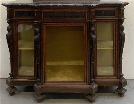 Sideboard di forma sagomata con tre ante a vetri e tre cassetti, fascia intagliata a motivi vegetali. Montanti decorati con cariatidi e piccoli rosoni. secolo XIX (cm 145x112x66) (difetti e rotture)