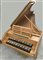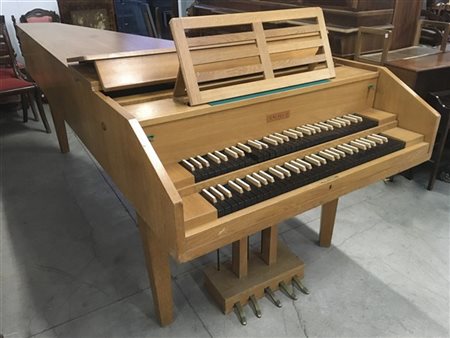Clavicembalo Ammer a due manuali con due registri da otto piedi al primo manuale, un registro di otto e uno di quattro al secondo manuale, unione e liuto. Cassa impiallacciata in rovere chiaro. Produzione anni '60/'70 del secolo XX (difetti)