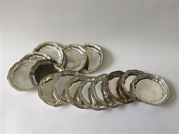 Lotto composto da quattordici piattini in argento con bordo sagomato e scanalato. Titolo 800. Argentiere Ricci, Alessandria (g 2100)