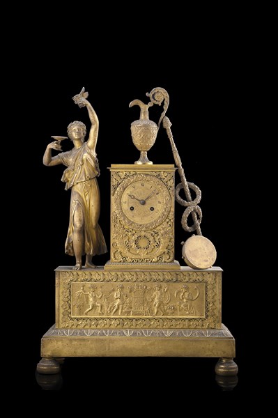 (Firma illeggibile) Pendola in bronzo dorato Cassa formata da un basamento ed u