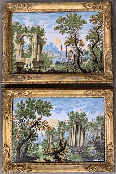 Manifattura Castelli del secolo XIX "Paesaggi con figure" e "Architetture classiche" coppia di piastrelle in maiolica (cm 40x27), in cornici dorate (difetti)
